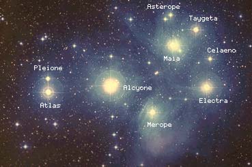Рассеянное звездное скопление Плеяды в созвездии Тельца. На фото указаны имена некоторых звезд.