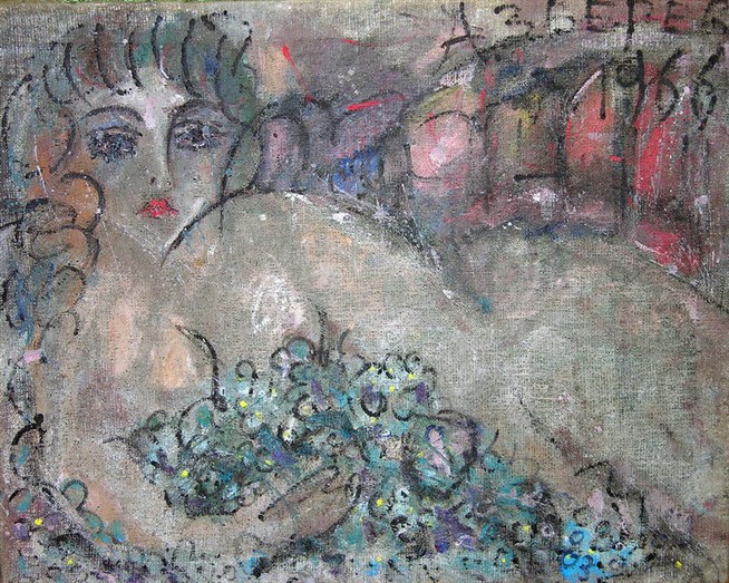 Анатолий Зверев. «Обнаженная с голубыми цветами». 1966. Мешковина, масло.