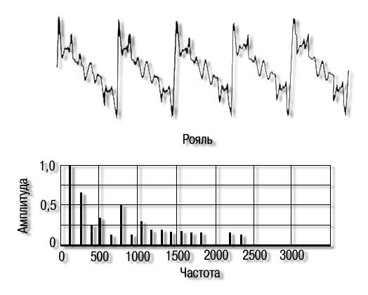 Форма колебаний (сверху) и частотно-амплитудный спектр (снизу) звуков рояля (основная частота 128 Гц).
