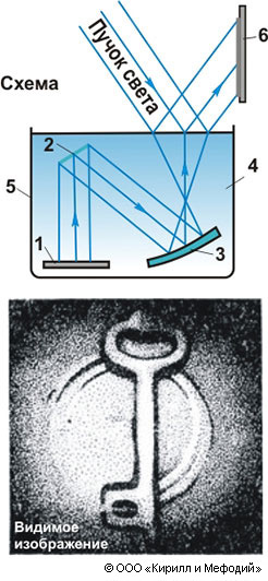 Звуковидение по методу поверхностного рельефа: 1 — источник звука; 2 — объект; 3 — вогнутое зеркало; 4 — жидкость; 5 — сосуд; 6 — экран.