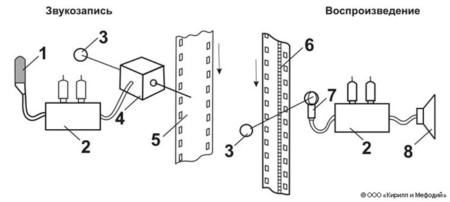 Схема фотографической звукозаписи и воспроизведения: 1 — микрофон; 2 — усилитель электрических колебаний; 3 — источник света; 4 — модулятор света; 5 — носитель записи (кинопленка); 6 — дорожка записи (фотографическая фонограмма); 7 — фотоэлемент; 8 — громкоговоритель. Стрелкой указано направление движения носителя записи.