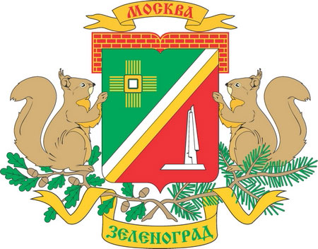 Герб города Зеленограда был принят 2 октября 2000 года. В щите московской формы узкая перевязь, скошенная серебром и золотом. В верхнем зеленом поле золотая с серебром стилизованная микросхема. В нижнем красном поле серебряный памятник-монумент защитникам Москвы. Щит наложен верхней частью на красный, мурованный золотом, фигурный зубец стены Московского Кремля. Над зубцом золотая лента с надписью красными буквами «Москва». Щитодержатели — две белки, сидящие на перекрещенных дубовой и еловой ветвях. Ветви перевиты золотой лентой с надписью зелеными буквами «Зеленоград». Узкая перевязь, скошенная серебром и золотом, символизирует железнодорожную линию и автомобильное шоссе, соединяющие Москву и Петербург. Микросхема отражает ведущую роль Зеленограда в отечественной электронной промышленности. Дубовая и еловая ветви символизируют лиственные и хвойные леса, окружающие город и непосредственно входящие в архитектурно-планировочную структуру Зеленограда. Белки часто встречаются в зеленоградских лесах.