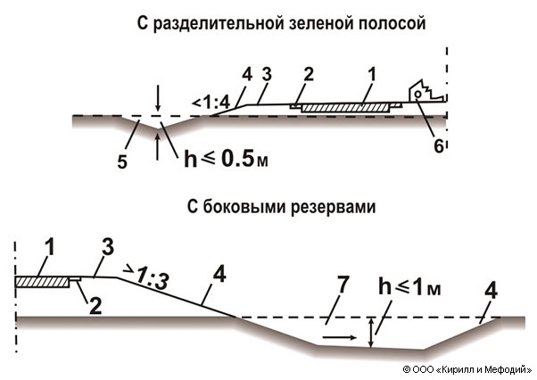 Схемы поперечных профилей земляного полотна автомобильной дороги: 1 — проезжая часть; 2 — полоса безопасности; 3 — обочины; 4 — откосы; 5 — кюветы; 6 — разделительная зеленая полоса; 7 — боковые резервы.