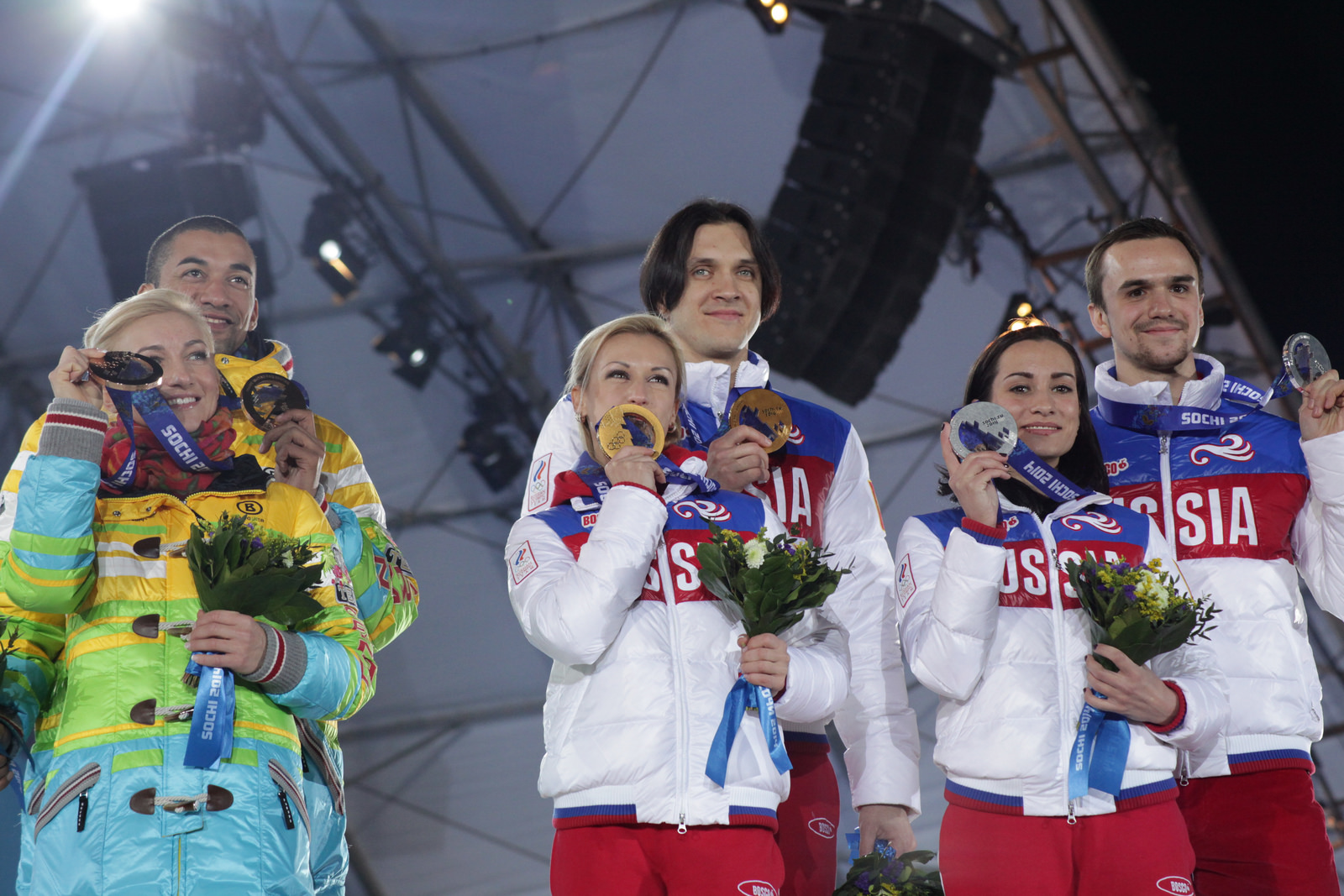Церемония награждения фигуристов. Олимпийские чемпионы Т.Волосожар и М.Траньков и серебряные призеры К.Столбова и Ф.Климов. Сочи, 2014 год. Фото: Professor Andy Miah, flickr