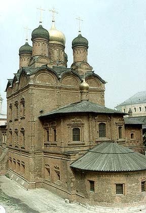 Зарядье. Собор Знаменского монастыря (1679-1684, архитекторы Ф. Григорьев, Г. Анисимов). Декоративные килевидные закомары, лаконичное оформление наличников, колончатые аркатуры на барабанах создают сдержанно-торжественный архитектурный образ храма, восходящий к образцам московского зодчества 16 века.