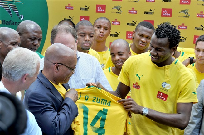 Джейкоб Зума получает форму команды Бафана от капитана команды Бонгани Хумало. 15 января 2013 года. Фото: GovernmentZA, flickr.com