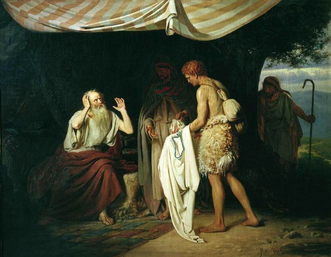Александр Никанорович Новоскольцев (1853-1919). Иаков узнает одежды Иосифа. 1880 год. Холст, масло. Нижегородский художественный музей.