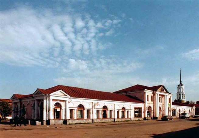 Шуя. Гостиный двор. Северный корпус. Построен в первой четверти 19 века на средства купца Киселева. Этот ансамбль в стиле позднего классицизма в значительной степени определил застройку торговой части города.