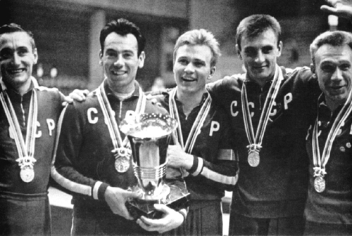 Команда советских рапиристов — чемпион Игр XVIII Олимпиады в Токио (Юрий Сисикин, Марк Мидлер, Герман Свешников, Виктор Жданович, Юрий Шаров).