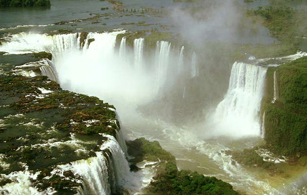 Вид с высоты птичьего полета на реку, низвергающуюся с водопада Игуасу между Бразилией (слева) и Аргентиной (справа).