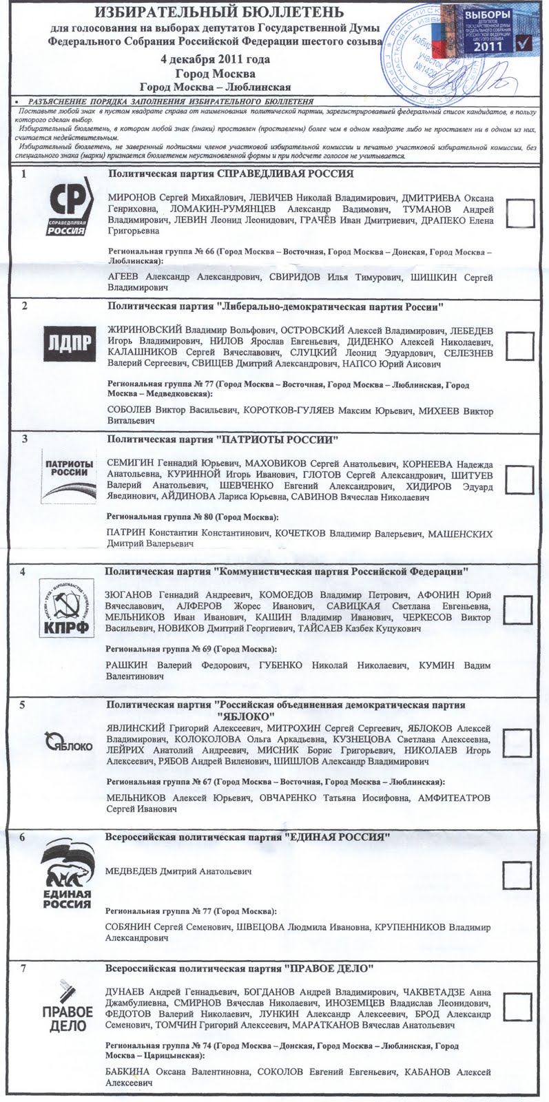 Избирательный бюллетень для голосования на выборах депутатов Государственной Думы. Москва, Россия. 2011 год. Фото: Наталья Овчинникова, picasaweb.google.com/106457897664675287458
