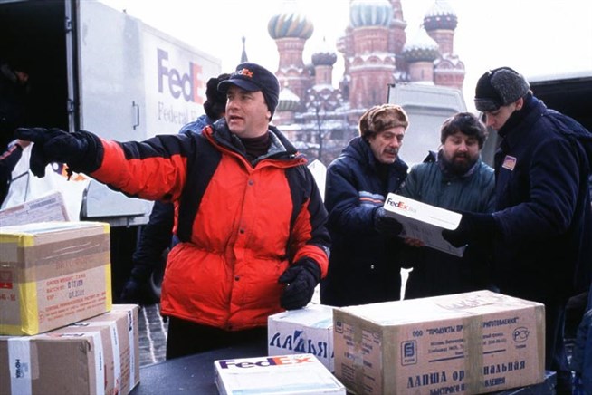 Чак Ноланд (Том Хэнкс) в Москве. Кадр из фильма «Изгой» (2000).
