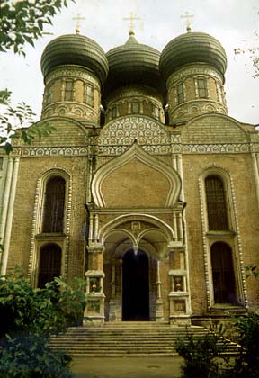 Покровский собор. Вид на западный фасад с единственным сохранившимся крыльцом. Закомары украшены поливными изразцами. Отреставрирован в 1976-1980 годах к открытию Олимпийских игр в Москве.