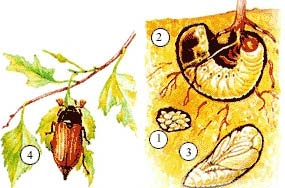 У многих насекомых наблюдается полное превращение, в ходе которого последовательно сменяются четыре стадии: яйцо (1) — личинка (2) — куколка (3) — взрослое насекомое (4).
