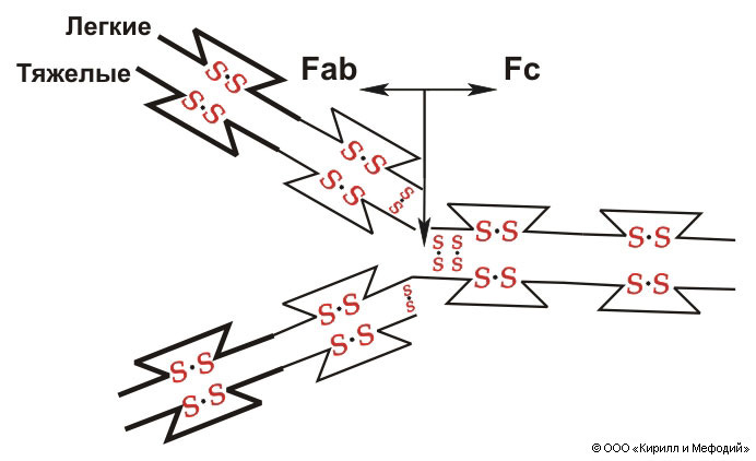 Схема молекулы иммуноглобулина G. Показаны две тяжелые и две легкие полипептидные цепи, соединенные межцепьевыми дисульфидными связями. Легкая цепь состоит из 2-х, тяжелая — из 4-х структурных единиц (петель), образованных внутрицепьевыми дисульфидными связями. Жирными линиями обозначены N-кoнцевые участки цепей, стрелкой — участок, чувствительный к протеолитическому расщеплению, в результате которого молекула распадается на два Fab-фрагмента, сохраняющих активность антител, и на Fc-фрагмент.