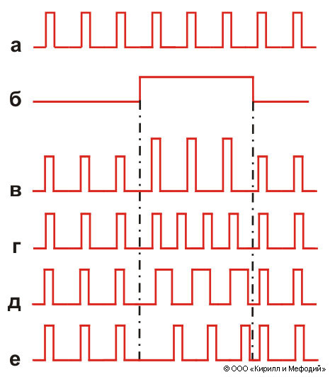 Различные виды импульсной модуляции: а — немодулированная последовательность радиоимпульсов; б — передаваемый сигнал; в — амплитудно-импульсная модуляция; г — частотно-импульсная модуляция; д — широтно-импульсная модуляция; е — фазово-импульсная модуляция.