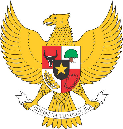 Герб Индонезии, принятый в 1950 году, представляет собой золотую птицу Гаруду, на груди которой расположен щит с изображениями диамантового щитка с золотой звездой, головы буйвола, дерева варингин (индийская смоковница), золотых веточек риса и хлопка, золотой замкнутой цепи с овальными и прямоугольными звеньями. В лапах Гаруда держит серебряную ленту с девизом: «Единство в многообразии» (другой перевод: «Различные, но единые»). На распростертых крыльях Гаруды — по 17 перьев, хвост птицы состоит из 8 перьев, грудь покрыта 45 чешуйками. Эти цифры символизируют дату провозглашения независимости — 17 августа 1945 года. Слова девиза принадлежат яванскому поэту 13 века Миу Тантулару. Они стали девизом унитарного индонезийского государства, население которого имеет ряд национальных, этнических, языковых, культурных различий.