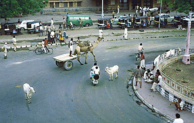 Священные для индусов коровы, одичавшие и тощие, свободно бродят среди городского транспорта в поисках корма.