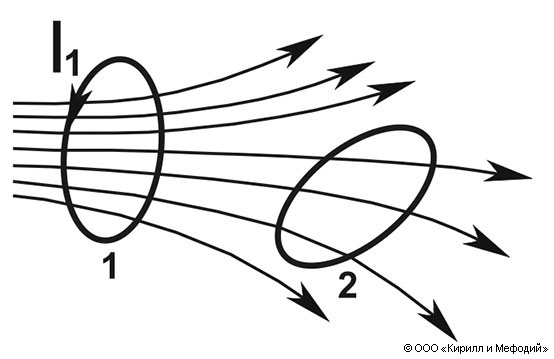 Часть линий магнитной индукции, создаваемых током в первом контуре, будет пронизывать площадь, ограниченную вторым контуром (т. е. будет сцеплена с контуром 2).