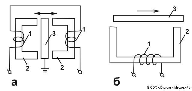 Схема конструкции индуктивного датчика: а — с переменным воздушным зазором; б — с переменной площадью воздушного зазора: 1 — катушка индуктивности; 2 — сердечник; 3 — якорь.