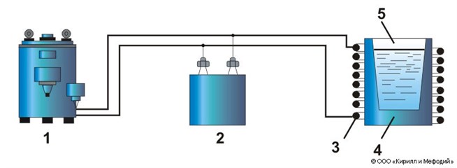 Схема установки индукционного нагрева: 1 — источник питания; 2 — блок реактивной емкостной мощности (конденсатор); 3 — индуктор; 4 — футерованное технологическое пространство (тигель); 5 — нагреваемый объект.