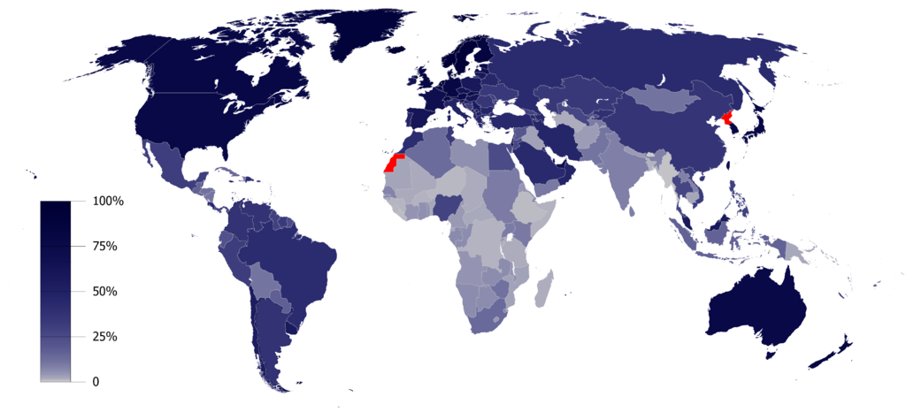 Карта распространения пользователей интернета по всему миру (% от населения). 2009 год. Источник:
