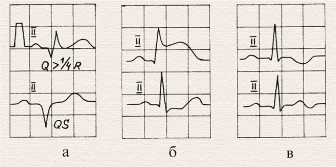 Изменения на электрокардиограмме при инфаркте миокарда: а) снижение амплитуды зубца R, углубление зубца Q (Q больше четверти R) и расширение его более 1, 5 мм или 0, 03 сек. Степень этих изменений зависит от глубины некроза. В случае трансмурального повреждения (некроза всей толщи сердечной мышцы) зубец R исчезает совсем и формируется комплекс QS; б) смещение сегмента (R)S-T выше или ниже изолинии больше чем на 0, 5 мм; в) формирование отрицательного зубца T в тех отведениях, где он должен быть в норме положительным, и наоборот (инверсия T).