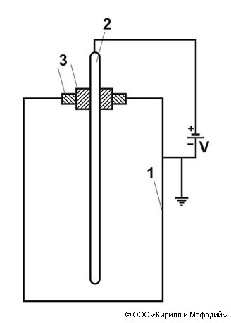 Сечение цилиндрической ионизационной камеры: 1 — цилиндрический корпус камеры, служащий отрицательным электродом; 2 — цилиндрический стержень, служащий положительным электродом; 3 — изоляторы.