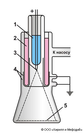 Схема ионного проектора: 1 — жидкий водород; 2 — жидкий азот; 3 — острие; 4 — проводящее кольцо; 5 — экран.