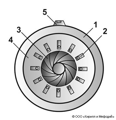 Ирисовая диафрагма: 1 — корпус диафрагмы; 2 — шпеньки лепестков диафрагмы; 3 — лепестки диафрагмы: 4 — диафрагменное кольцо; 5 — переводной рычаг.