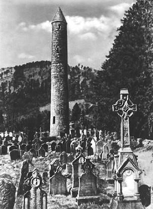 Сторожевая башня-колокольня монастыря в Глендалохе. Памятник древнейшей кельтской христианской культуры, независимой от Рима и процветавшей в период его упадка. Монастырь в Глендалохе был основан святым Кевином (6 в.) и процветал вплоть до 12 века. Рядом — могилы с каменными крестами древней кельтской формы. Для них характерен напряженный ритм плетеного ленточного орнамента.