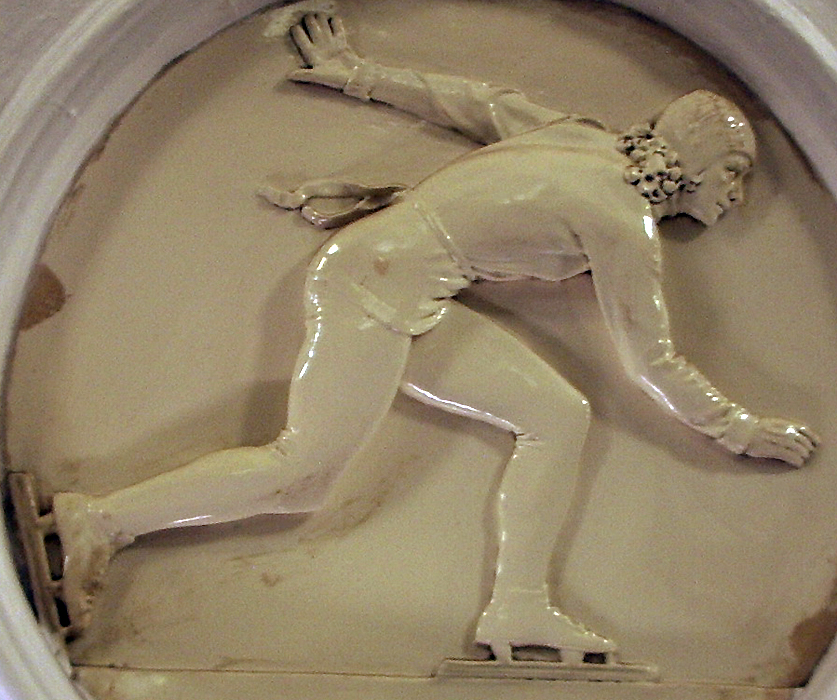 Конькобежка. Барельеф на станции «Динамо» Московского метрополитена. Работа скульптора Елены Янсон-Манизер. Моделью для создания барельефа послужила М.Г. Исакова.