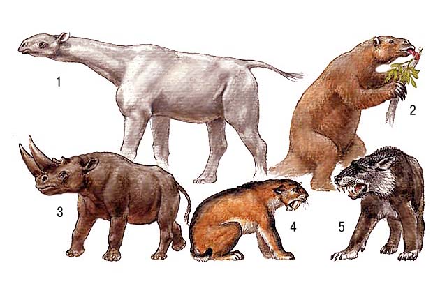 Ископаемые животные (млекопитающие): 1 — безрогий носорог (индрикотерий); 2 — гигантский наземный ленивец (мегатерий); 3 — двурогий носорог (арсиноитерий); 4 — саблезубый тигр (махайрод); 5 — хищное млекопитающее (эндрюсархус).
