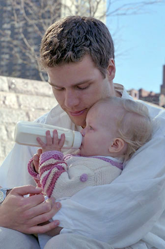 Малыша, находящегося на искусственном вскармливании, в состоянии накормить и папа.