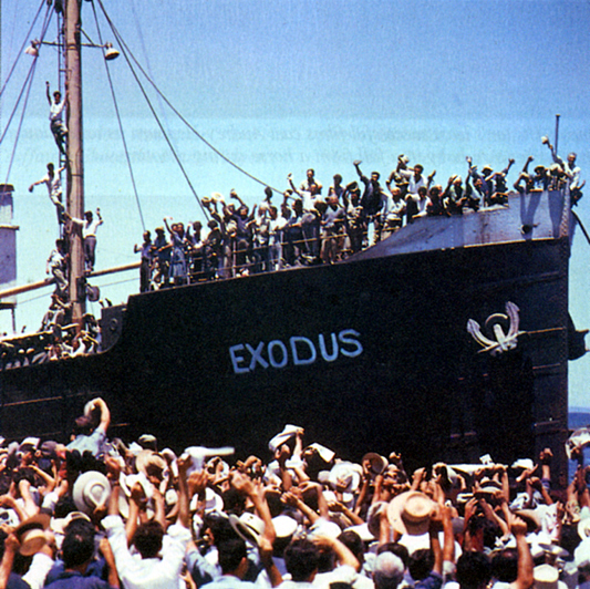 Прибытие корабля в израильский порт. Кадр из фильма режиссера Отто Преминджера «Исход». 1960 год.