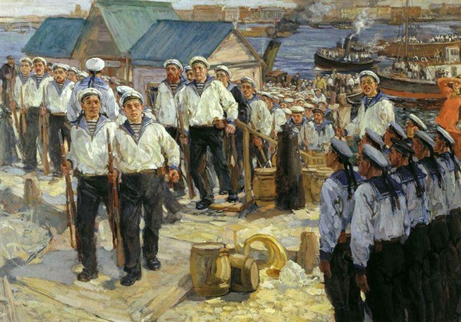 Иван Георгиевич Дроздов (1880-1939). Прибытие кронштадтских моряков в Петроград для участия в демонстрации 4 июля 1917 года. Начало 1930-х годов. Холст, масло. Центральный военно-морской музей.