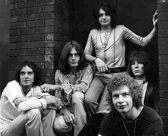 "Группа «Йес» в конце 1960-х гг. (третий слева — вокалист Йон Андерсон; на переднем плане — барабанщик Билл Брафорд).".
