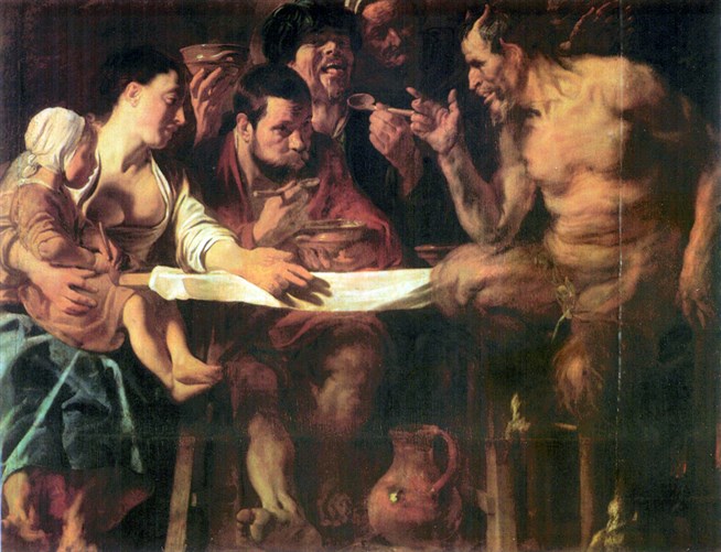 Якоб Йорданс. Сатир в гостях у крестьянина. Около 1622 года. Холст, масло. Музей изобразительных искусств имени А.С. Пушкина, Москва. Картина написана на сюжет из басни Эзопа. Сатир поразился двуличию крестьянина, который дует на кашу, чтобы ее охладить, и на руки, чтобы их согреть.
