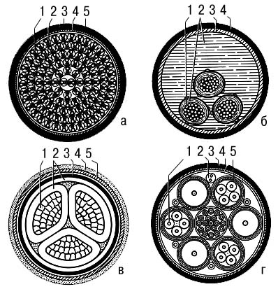Схемы поперечных сечений некоторых типов кабелей: а — телефонного кабеля для городских сетей; б — маслонаполненного в стальном трубопроводе для передачи больших мощностей; в — силового бронированного без защитных покровов для силовых и осветительных установок; г — телевизионного для подключения передвижных телекамер к источнику питания и передающей аппаратуре; 1 — токопроводящая жила; 2 — изоляция; 3 — оболочка; 4 — наружные защитные покровы; 5 — броня, экран.
