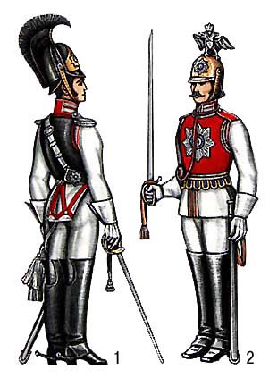 Кавалергарды: 1 — обер-офицер, 1820-е гг.; 2 — рядовой в дворцовой форме, конец 19 — начало 20 вв.