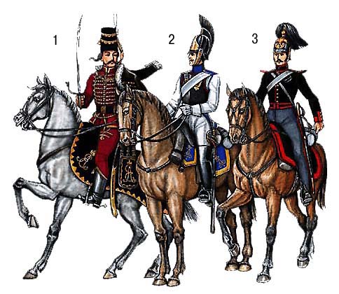 Кавалерия: 1 — рядовой Острогожского гусарского полка, 1763-76; 2 — рядовой Стародубовского кирасирского полка, 1813-14; 3 — рядовой Казанского драгунского полка. 1851-55.