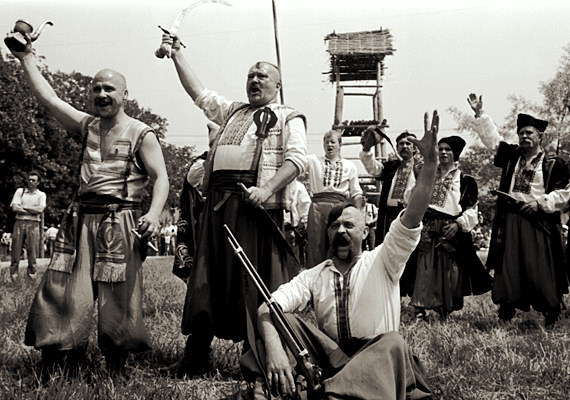 Участники фестиваля народного искусства «Хортица» в костюмах запорожских казаков. Запорожье.
