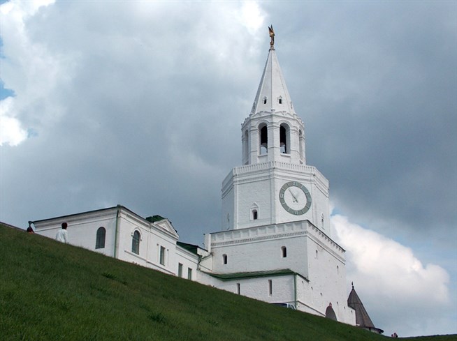 Спасская башня Казанского кремля. Здание башни было воздвигнуто на древнем каменном основании в 17 веке.