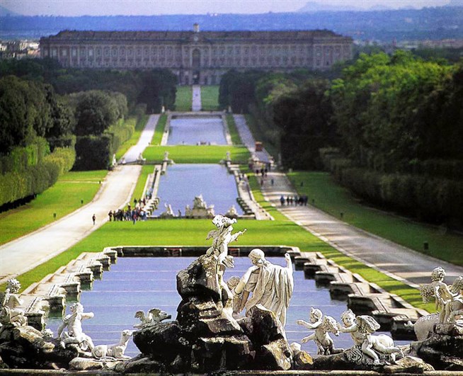 Особенностью паркового ансамбля в Казерте являются искусственные ступенчатые пруды, вода в которых постепенно перетекает с одного уровня на другой и из одного пруда в другой.