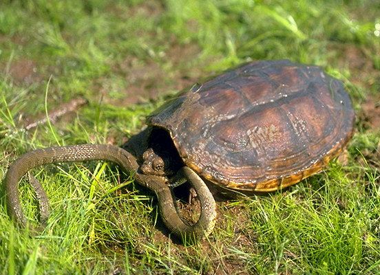 Каймановая черепаха, поймавшая водяного ужа