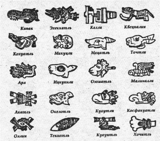 Иероглифы 20 ацтекских дней: Кипак — монстр; Эхеккатль — ветер; Калли — дом; Квецпалин — ящерица; Кохуатль — змея; Микуцли — череп; Мацатль — олень; Точтли — кролик; Арл — вода; Ицкуинли — собака; Озоматль — обезьяна; Малиналли — поворот; Акатль — тростник; Окелотль — рискованное предприятие; Куаутли — орел; Косфакуатли — стервятник; Оллин — движение; Текпатль — кремень; Куауитль — дождь; Хочитль — Цветок.