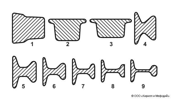 Сечение рельса при его последовательной прокатке в 9 проходов.