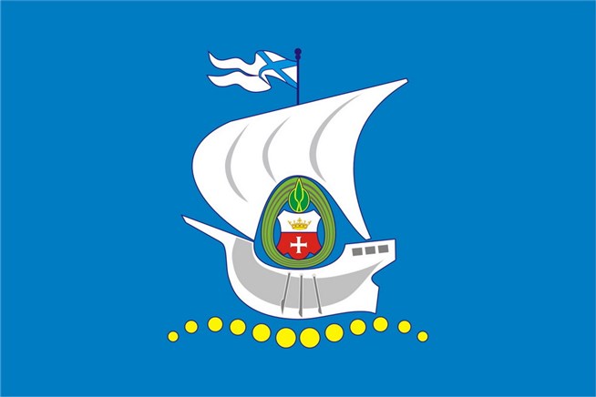 Описание: Прямоугольное полотнище насыщенного сине-голубого цвета с отношением ширины к длине 2:3. В центре полотнища — фигуры герба города Калининграда: плывущий к древку по волне, составленной из 12 шаров жёлтого цвета (диаметр которых увеличивается от краёв к центру), одномачтовый корабль белого цвета с распущенным парусом и развевающимся флюгером, в крыже которого — диагональный крест синего цвета; ниже паруса на мачту наложен фигурный щит со старинным гербом Альтштадта (в верхней белой части красная корона, в нижней красной части — белый крест), окружённый овальным венком из ленты, состоящей из 4 зелёных и 3 чёрных полос, и увенчанный вверху трилистником зелёного цвета. Габаритная ширина корабля составляет 1/3 длины полотнища.