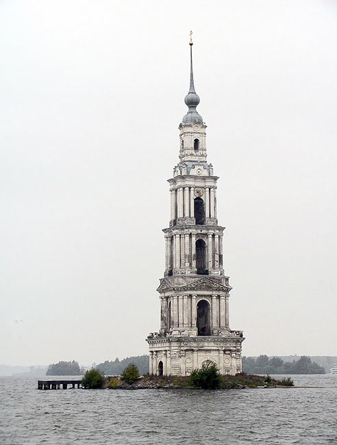Калязин. Колокольня Никольского собора. Высота 74 м. Никольский собор был возведен в 1796-1800 на месте некогда существовавшего в 12-13 вв. монастыря «Никола на Жабне». Колокольня располагалась в центре ансамбля Торговой площади и являлась высотной доминантой города. После строительства Угличской гидроэлектростанции и образования одноименного водохранилища, колокольня стала единственным, что осталось от исторического центра Калязина.