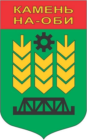 Герб города Камень-на-Оби, принятый 8 июня 1976 года. На зеленом поле щита изображены три золотых колоса, черная шестерня и черный железнодорожный мост. В верхней части щита на красном фоне название города. В 2003 году был принят новый герб города.